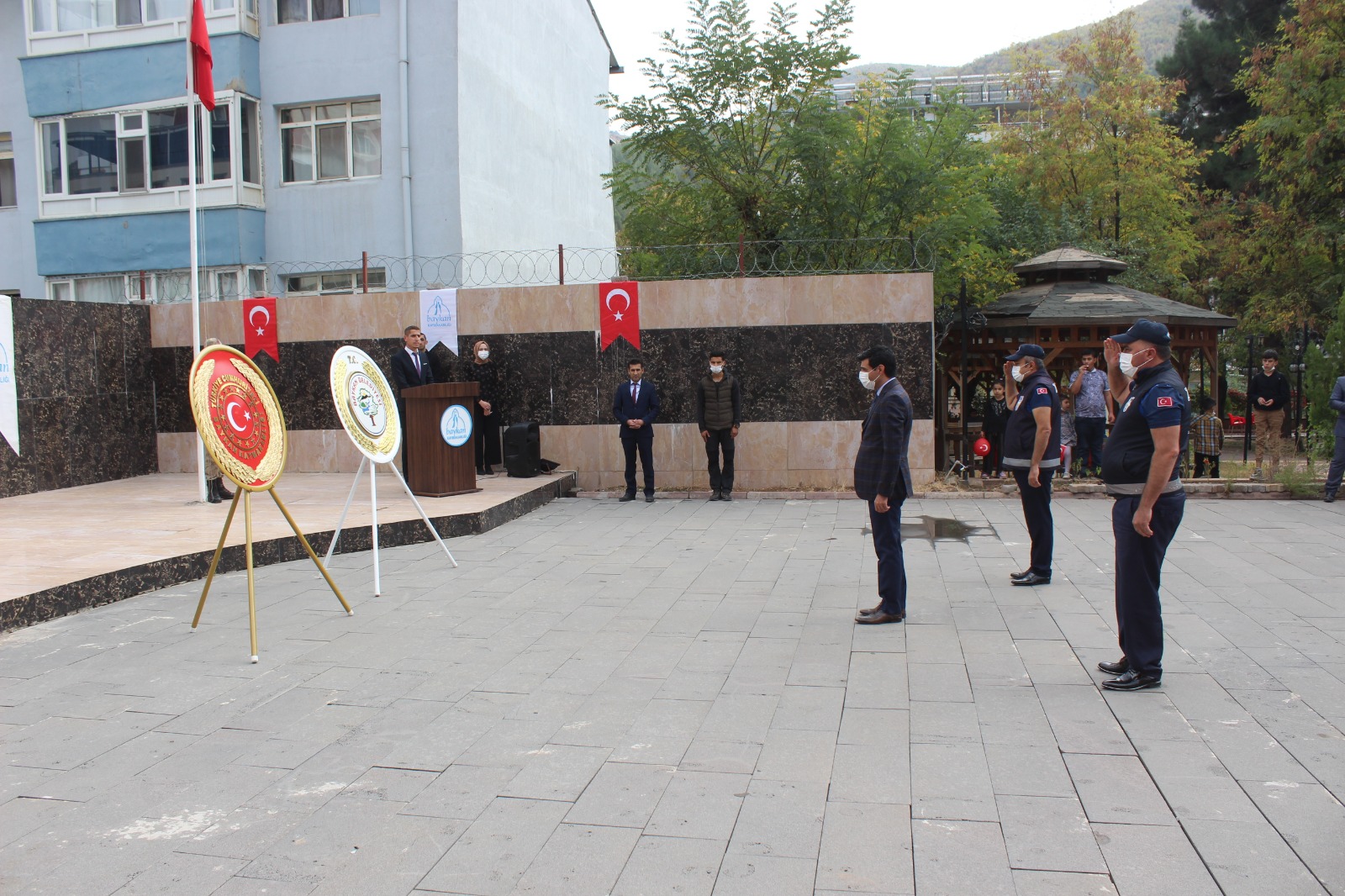 Siirt’in Baykan ilçesinde 29 Ekim Cumhuriyet Bayramı 98. Yıl dönümü kutlamaları Atatürk Anıtına çelenk sunma ve saygı duruşu ile ile başladı.   İlçenin tören alanında düzenlenen törene Kaymakam / Belediye Başkan V. Emin Bağlı, Cumhuriyet Savcısı Alper Can Türkeş, Cumhuriyet Savcısı Mustafa Sarı, İlçe Jandarma Komutanı J.Yüzbaşı Hüseyin Tetik İlçe Emniyet Amiri Ömer Dalaslan, Veyselkarani Belde Belediye Başkanı Murat Akgün,AK Parti ilçe Başkanı Nimetullah Gönül, MHP İlçe Başkanı Halit Söyüncü , Baykan Esnaf ve Sanatkarlar Odası Başkanı Osman Gülümser, İl Genel Meclis Üyesi Cahid Türköz Daire Amirleri, Sivil Toplum Kuruluşları Temsilcileri, Muhtarlar ve çok sayıda vatandaş katıldı. Kaymakam Bağlı. tarafından Atatürk Anıtına çelenk sunuldu, ardından Saygı Duruşu ve İstiklal Marşı okundu.  Törenlere yarın da devam edilecek.