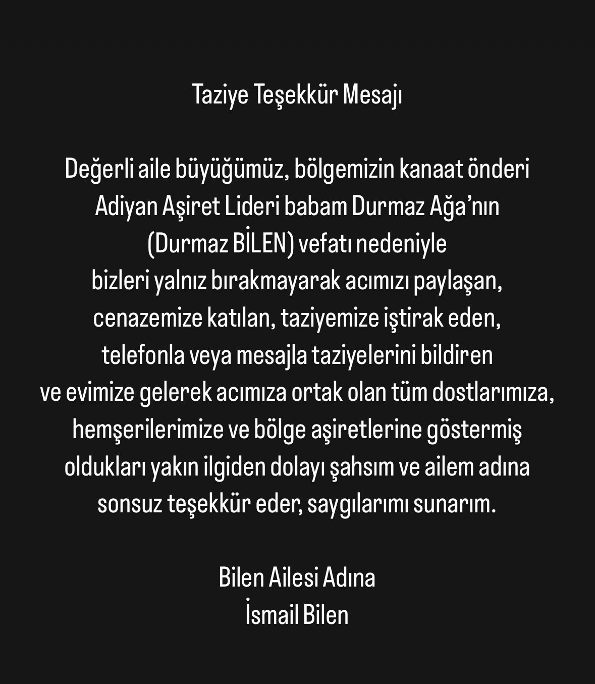 Merhumun oğlu İsmail Bilen, bir teşekkür mesajı yayımlayarak, kendilerini yalnız bırakmayan tüm dostlarına, hemşerilerine ve bölge aşiretlerine duyduğu minnettarlığı dile getirdi. Mesajında, cenaze törenine ve taziye ziyaretlerine katılarak acılarına ortak olan, telefonla ya da mesajla taziyelerini ileten herkese teşekkür etti.