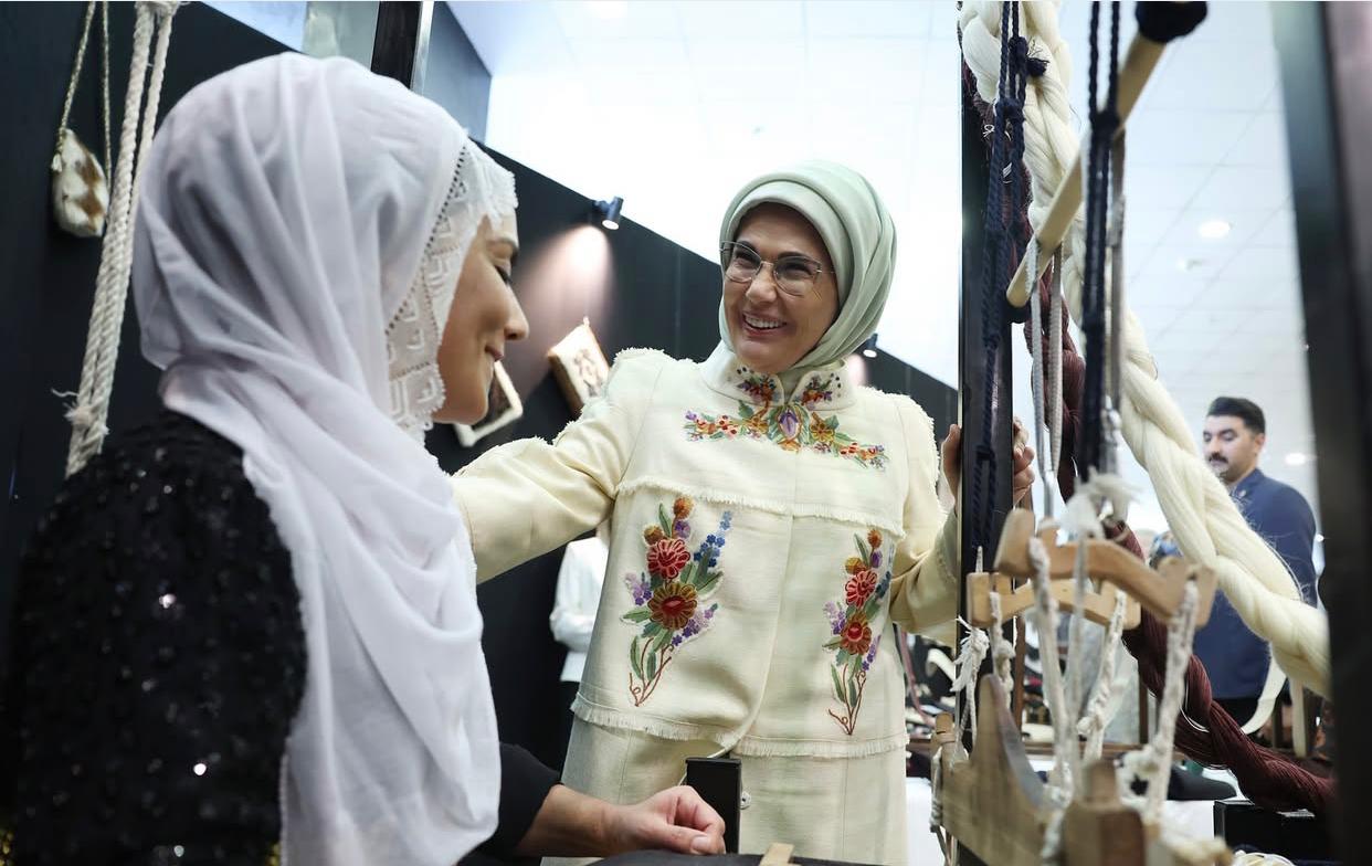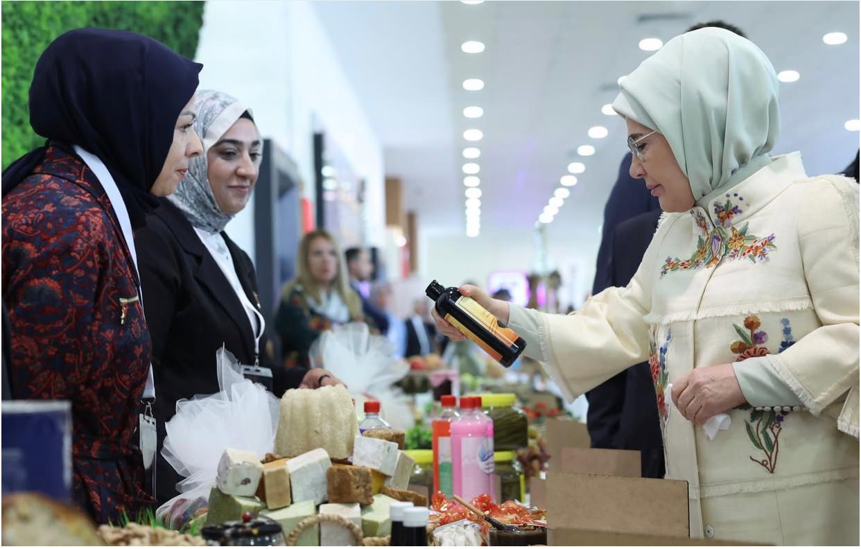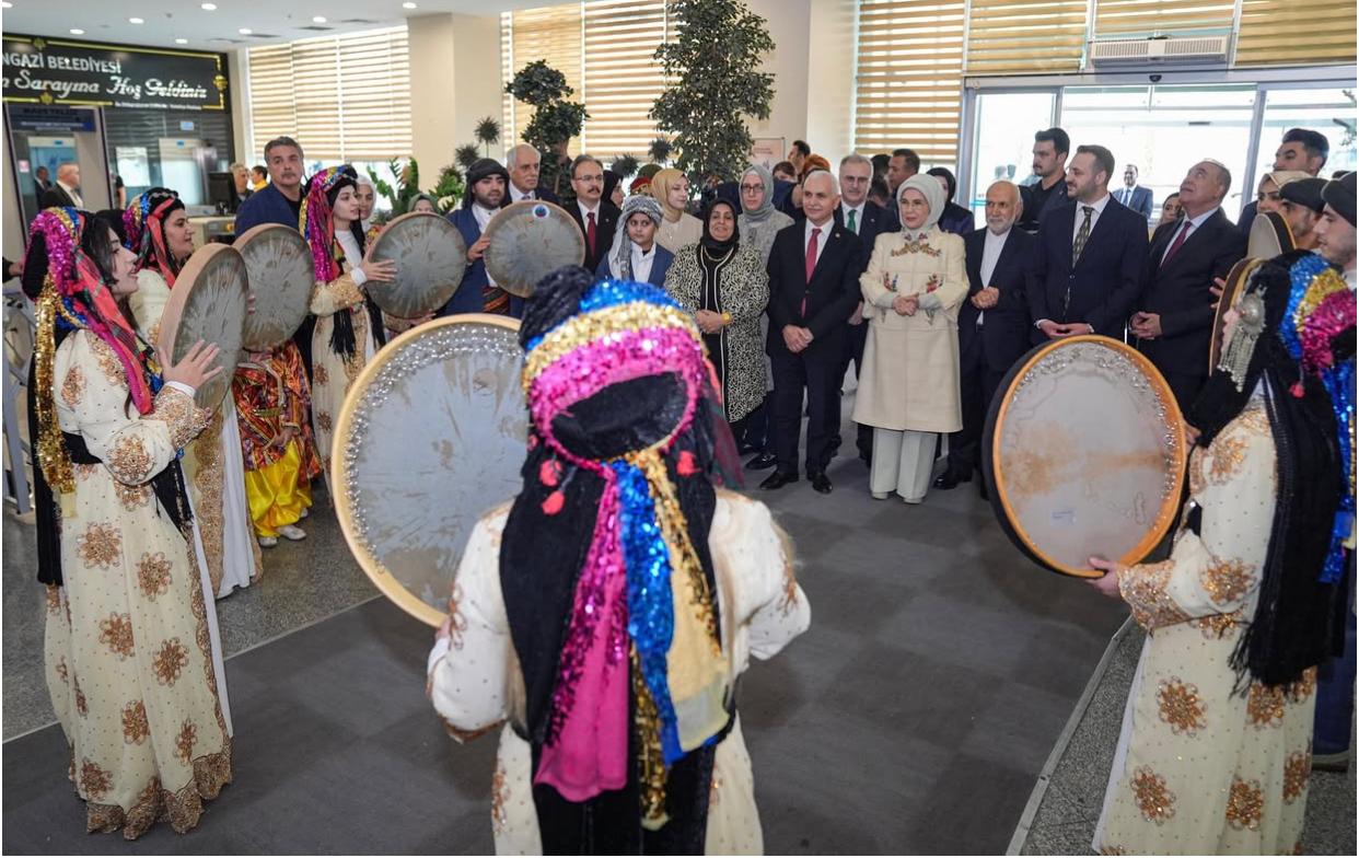 Siirt Valisi Dr. Kemal Kızılkaya Vakıf Genel Başkanı Zeki Akyüzlü ve eşleri tarafından karşılanan Erdoğan Siirt’te Olgunlaşma Enstitüsü ve kadın kooperatiflerinin ürünlerinden oluşan sergiyi gezdi.