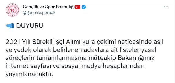 Gençlik ve Spor Bakanlığı tarafından 4 bin 346 işçi alımı yapılacağı duyurulduktan sonra başvurular belirtilen tarihlerde alınmıştı. Öte yandan 15 Eylül 2021 Çarşamba günü ise GSB kura çekimi canlı yayın yapıldı ve kura çekimi neticesinde asıl ve yedek olarak belirlenen adayların isim listesi de belli oldu. Adaylar bu kapsamda; GSB kura sonuçlarının ne zaman açıklanacağını merak ederken GSB işçi alımına ilişkin son dakika açıklaması Gençlik ve Spor Bakanlığı’nın resmi Twitter hesabından yapıldı. işte o açıklama “2021 Yılı Sürekli İşçi Alımı kura çekimi neticesinde asıl ve yedek olarak belirlenen adaylara ait listeler yasal süreçlerin tamamlanmasına müteakip Bakanlığımız internet sayfası ve sosyal medya hesaplarından yayımlanacaktır.”
