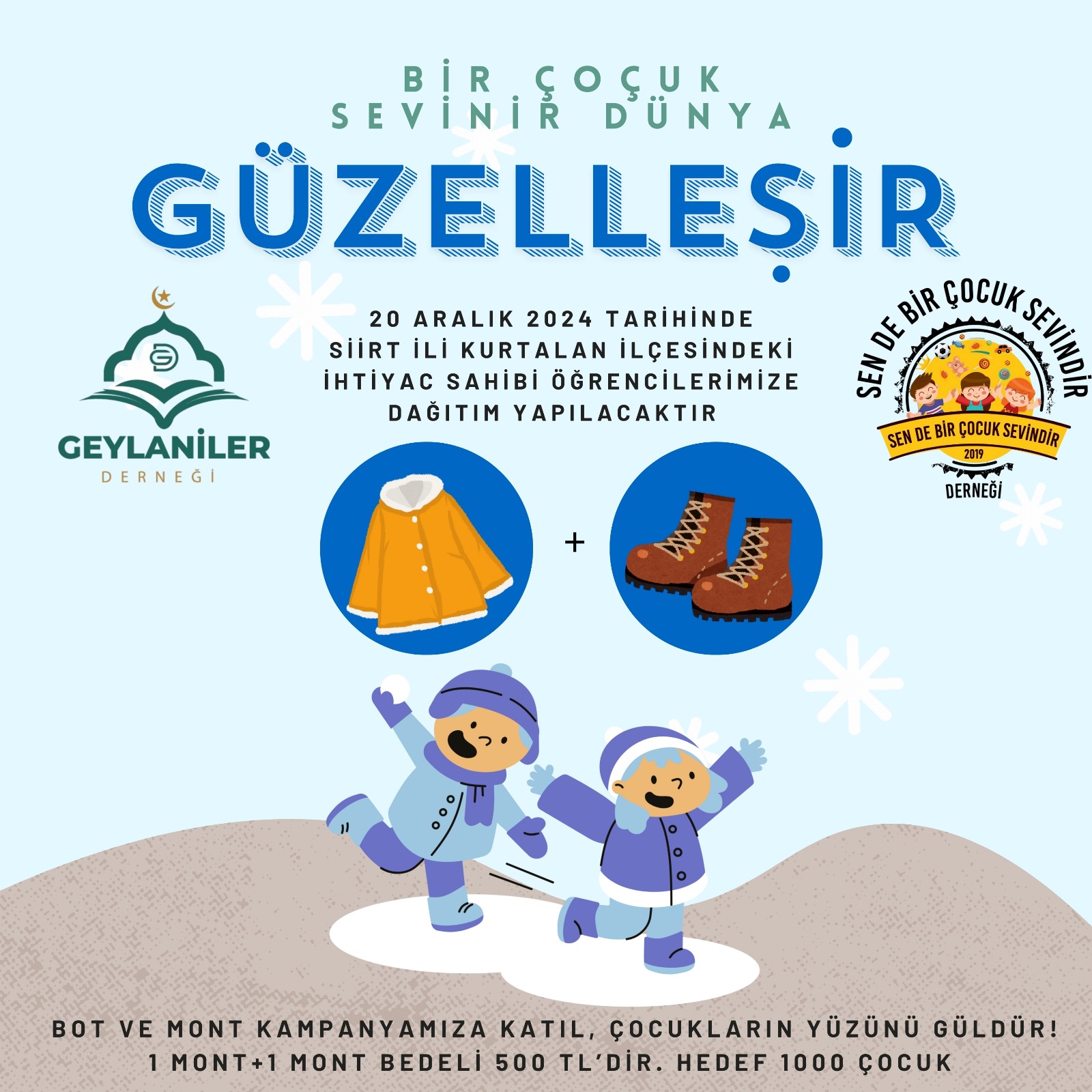 “Sen De Bir Çocuk Sevindir Derneği” ile “Geylani Derneği” organizasyonunda Kurtalan’da 1000 çocuk giydiriliyor.