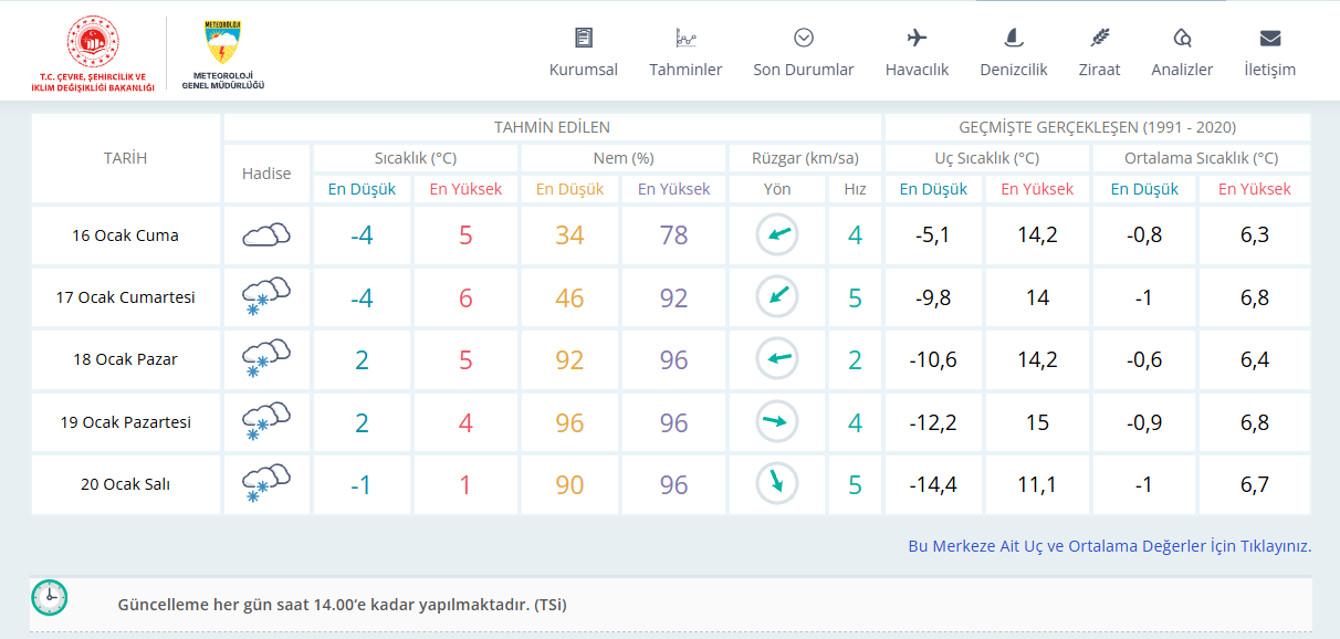 Tahminlere göre 17 Ocak Cumartesi günü karla karışık yağmur ve kar yağışı görülecek. Hava sıcaklığı gece -4 dereceye kadar düşerken, gündüz en yüksek 6 derece civarında seyredecek. Nem oranının yüzde 92’ye kadar çıkması bekleniyor.