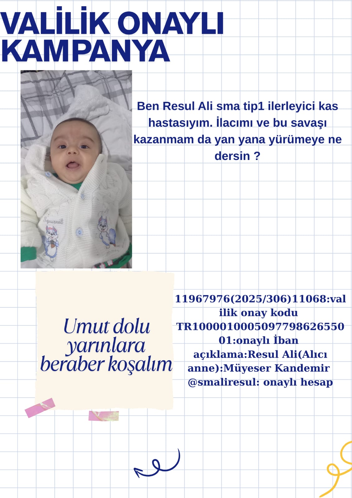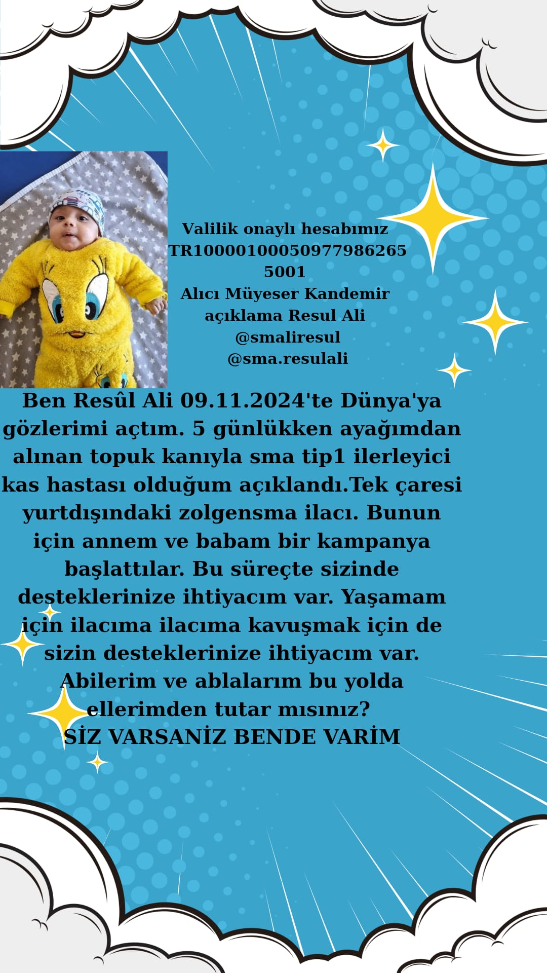 Küçük büyük demeden herkesin yardımını beklediklerini ifade eden anne Müyesser Kandemir “ 2024 yılı sonunda doğan oğlum daha beş günlük iken SMA 1 tip teşhisi kondu.Valilik onaylı yardım kampanyası açtık. Oğlumun yasaması desteğe bağlıdır Bu hastalıkta yurt dışındaki tedavi olumlu sonuçlar vermektedir. Oğlumu kaybetmek istemiyorum. Herkesin desteğini bekliyorum.” Dedi.