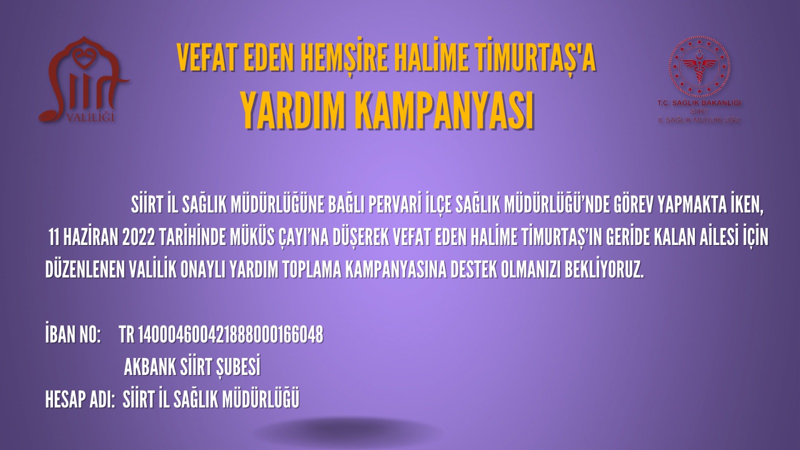 Siirt İl Sağlık Müdürlüğü tarafından yürütülen kampanya kapsamında açılan banka hesap numaraları aşağıya çıkarılmıştır.